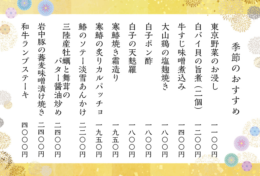 旬の食材を使った限定のおすすめ一品です。お食事のお供 またワイン、日本酒等ご一緒にもお楽しみいただけます。