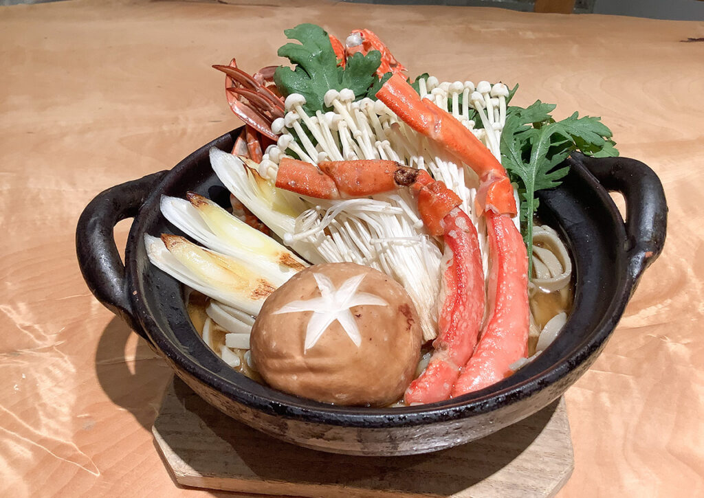 蟹をのせた豪華な鍋焼き蕎麦。身体も温まる熱々のお鍋は太打ち蕎麦なので味がしっかり感じられます。