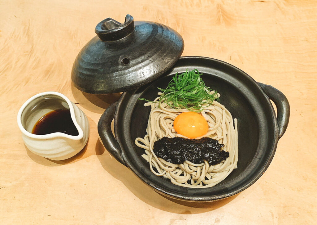茹で揚げの蕎麦を冷水で締めずそのままお出しします。卵、九条ねぎ、海苔の佃煮とつゆを絡めて様々な味をお楽しみください。