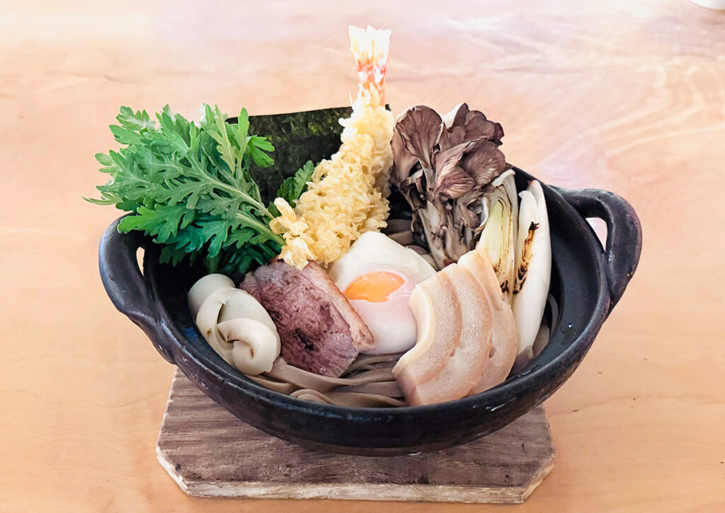 Nabeyaki Soba with prawn tempura and duck, egg, fish cake and fu(wheat gluten)